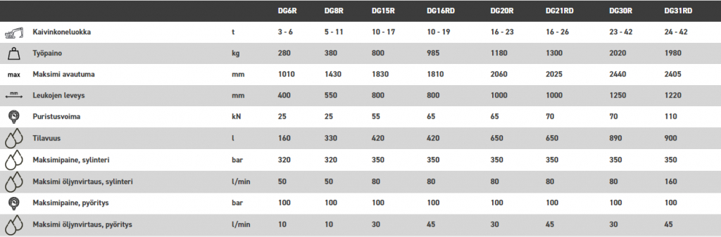 Lisävarusteet: Kotimainen Robi DG purku- ja lajittelukoura on ammattilaisen valinta vaativiin erottelu- ja käsittelytöihin. Se soveltuu lisäksi myös tiili- sekä puurakenteiden purkamiseen. Heti varastosta nopealla toimituksella! Tuotteen ominaisuudet: 8 eri kokoluokkaa (3 - 42 t peruskone) Kulutusta kestävä rakenne Ainutlaatuinen leukojen synkronointijärjestelmä Mahdollista saada pyörityksellä tai ilman 2 moottorinen pyöritys saatavilla DG15 mallista ylöspäin 3 eri leukavaihtoehtoa